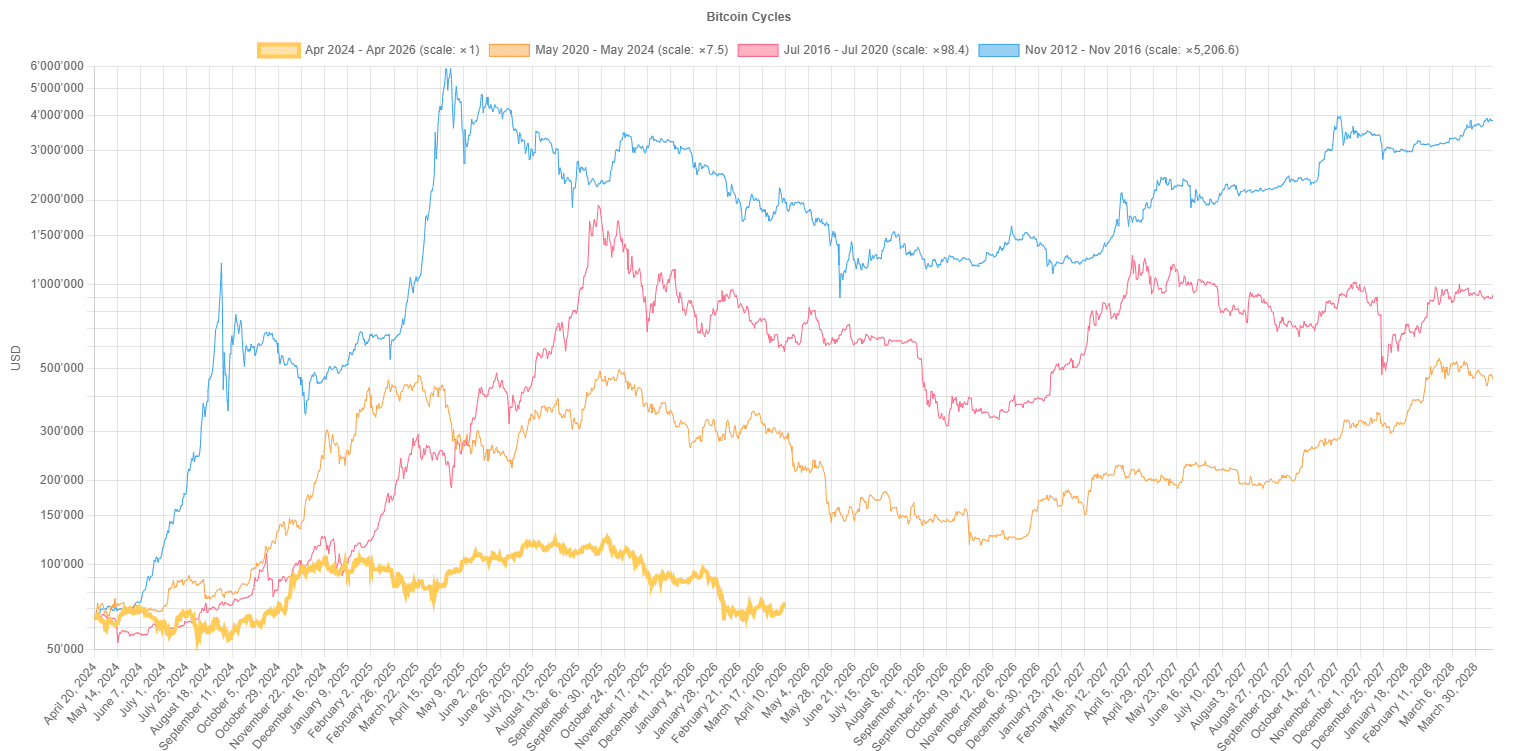 Following on a last week's concept, and using the halving event as a reference point, we can anchor each Bitcoin cycle, from halving to halving, and overlay them. This is where the similarities become clear. First, we see diminishing returns with each cycle, as every subsequent bull market delivers less explosive growth than the previous one. More importantly, Bitcoin exhibits a highly unusual timing pattern for financial markets. On average, cycle tops have occurred between 370 and 540 days after the halving, a fairly wide range but still useful as a framework. Cycle bottoms, on the other hand, have historically taken place around 900 days post-halving, which would point to a potential bottom for this cycle around late October.